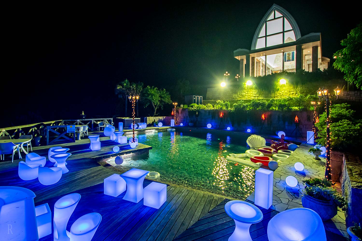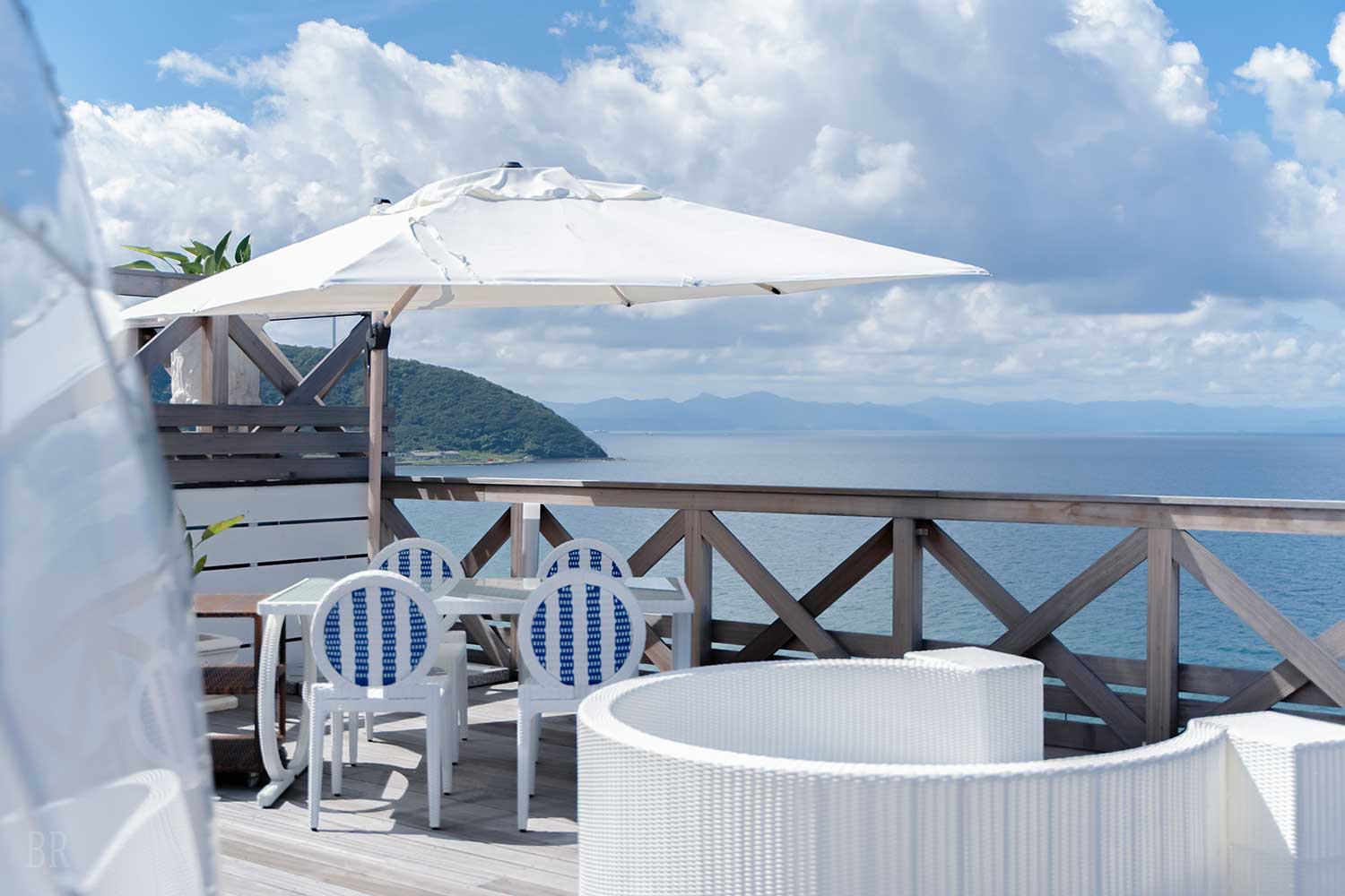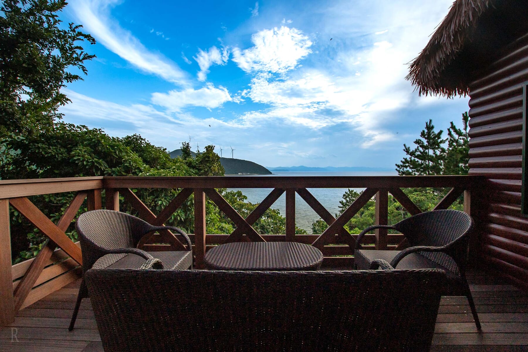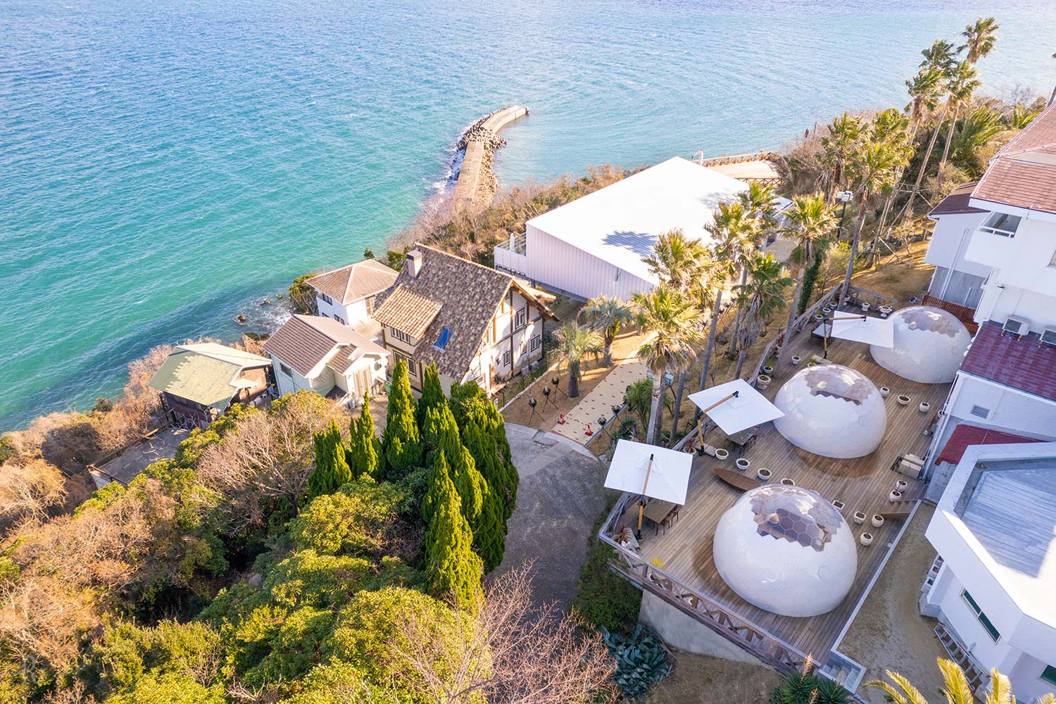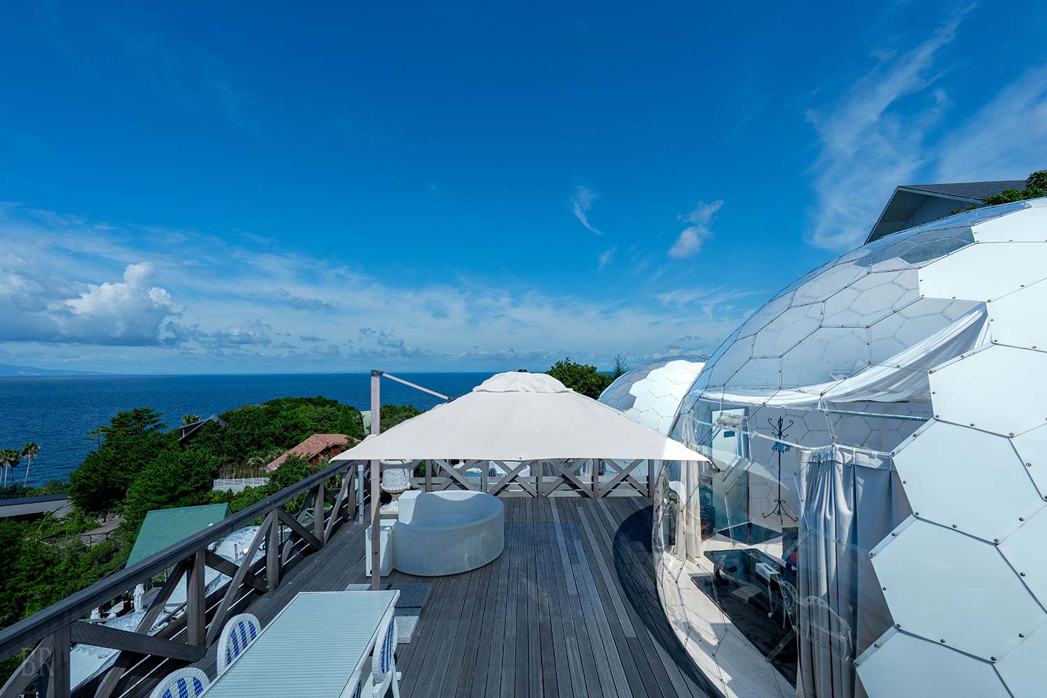 ドームテントは壁の一部が透明になっており、コテージやヴィラには青い海を望むテラスを完備。