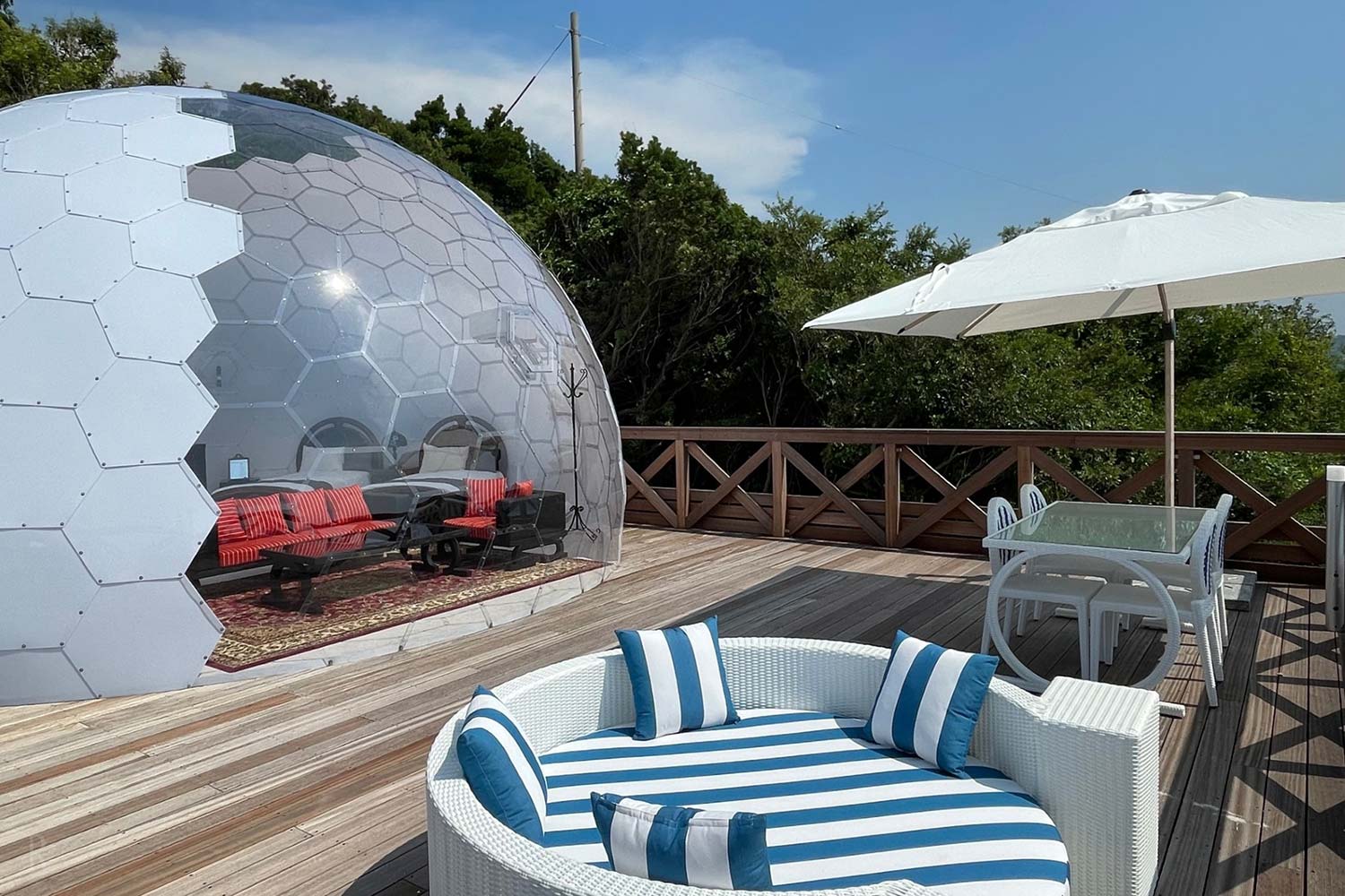 全棟愛犬同伴可能な透明ドームテントは、日中は瀬戸内海の絶景オーシャンビューを、夜は星空に包まれる幻想的なひとときをお届けします。