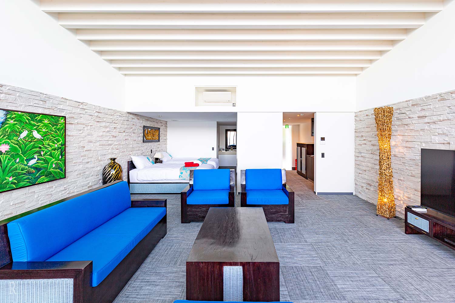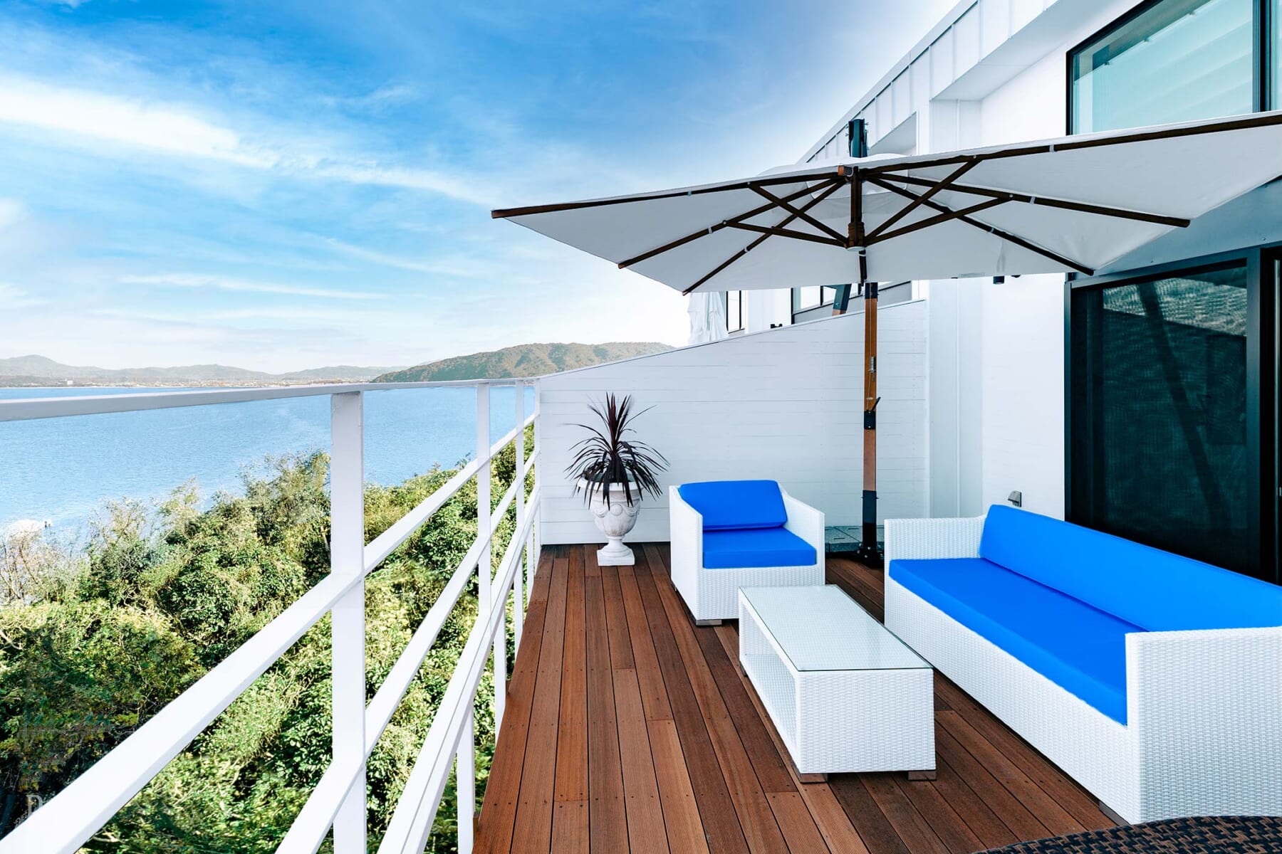 ブルーを基調にデザインされたラグジュアリーなプライベート空間。バルコニーからは瀬戸内海を望む絶景のオーシャンビューが広がります。