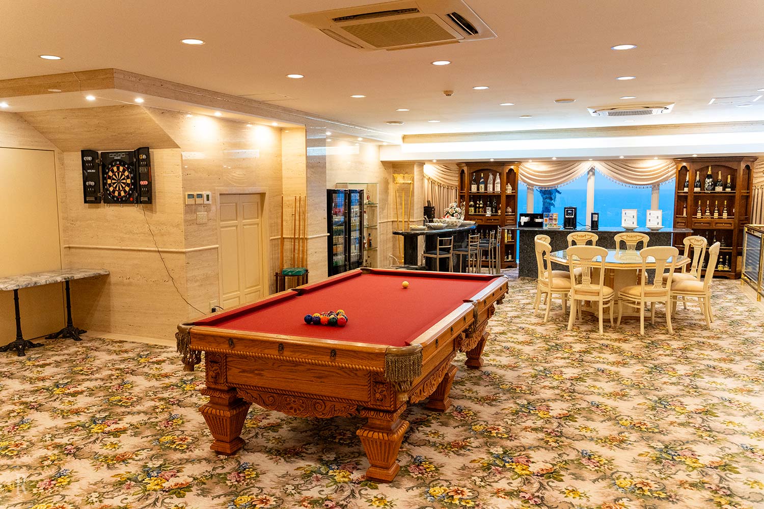 敷地内にはビリヤード・ダーツ・漫画コーナーなど、滞在中に楽しめるアミューズメントが充実。