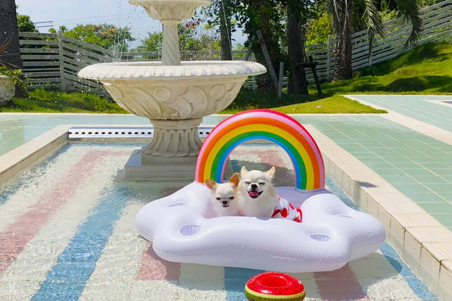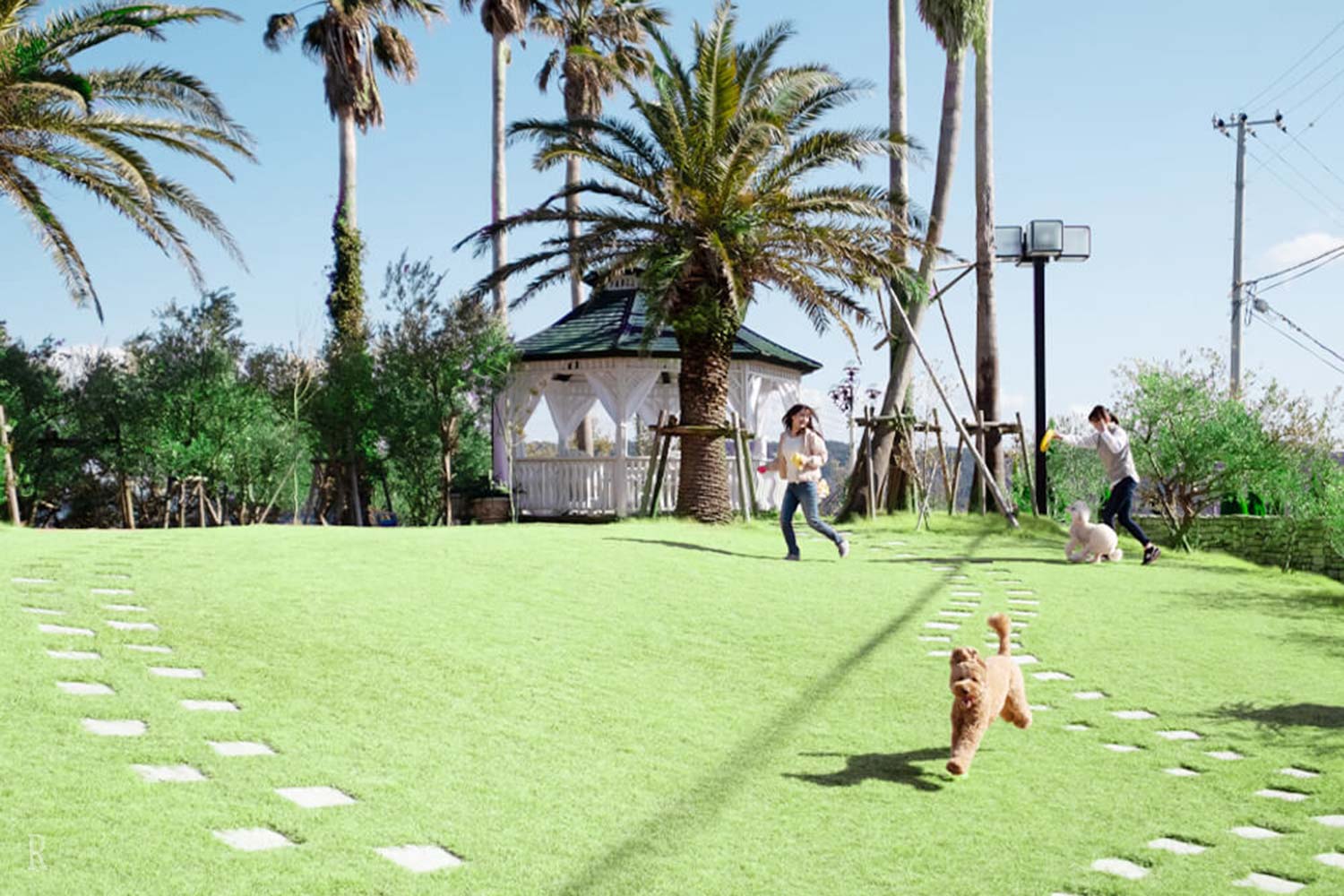 敷地内には広々とした天然芝のドッグランや夏季限定のドッグプールを無料で利用できるほか、愛犬用メニューが豊富に揃うカフェも併設。